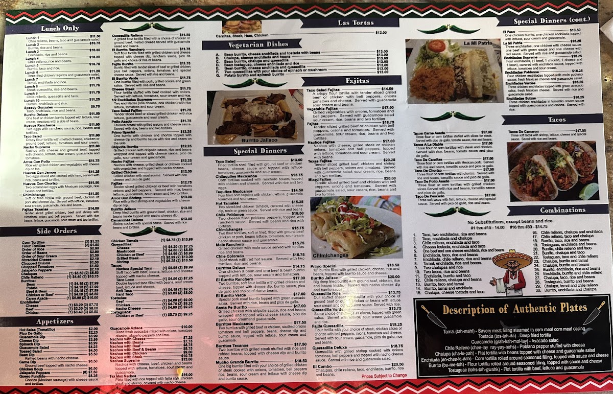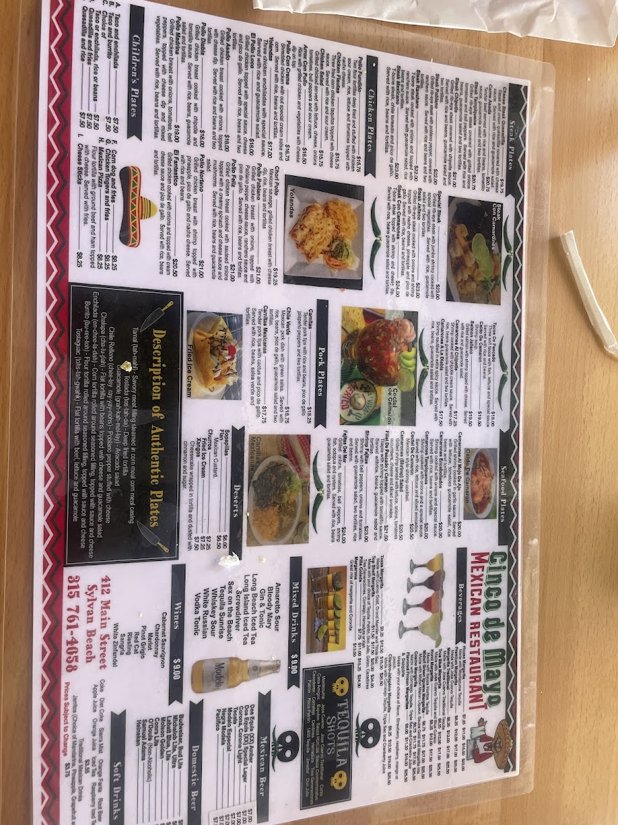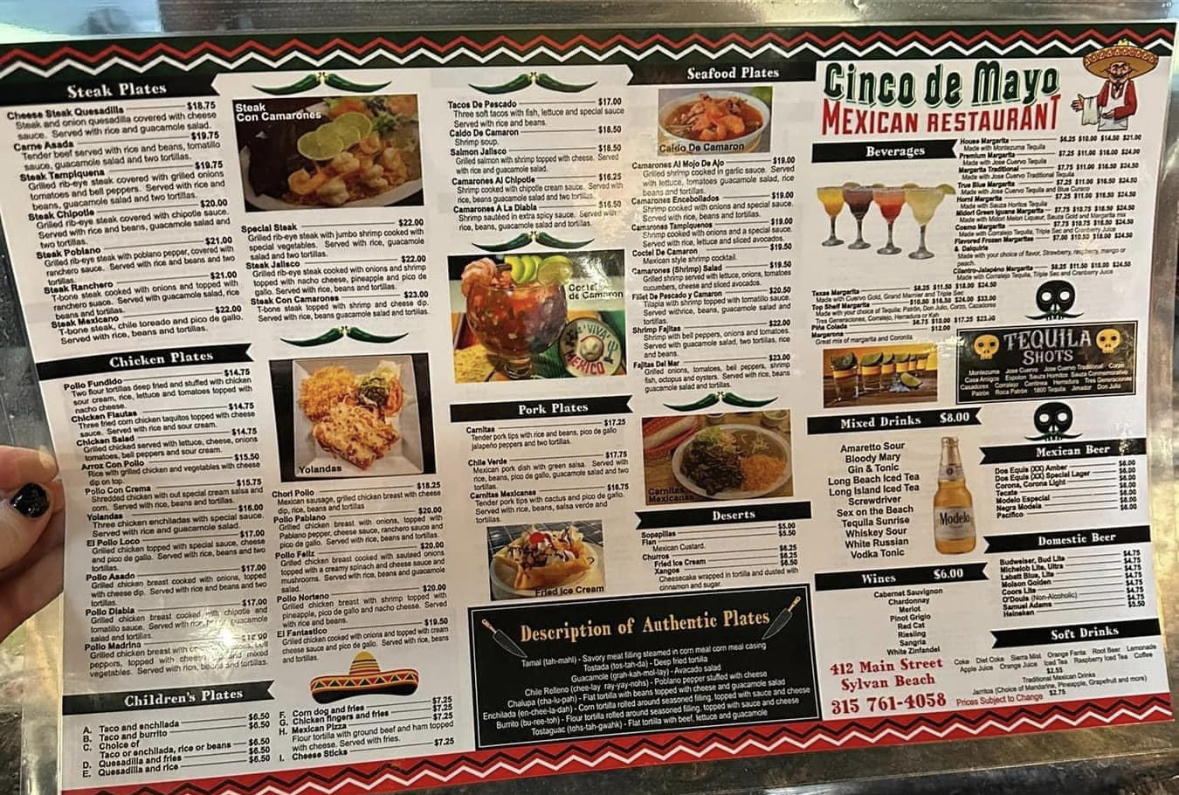 From a reviewer’s perspective, the menu at Cinco De Mayo at 412 Main St, Sylvan Beach, NY, presents a rich tapestry of classic Mexican flavors with options for every taste. The combinations section impresses with hearty mixes like Burrito, Chile Relleno And Taco for $20, Chalupa, Burrito And Beans for $24, and Burrito, Enchilada, Rice And Beans for $25, offering generous portions that satisfy both appetite and variety. Vegetarians are well-catered to with choices such as Fajitas, Bean Burrito, Cheese Enchilada And Tostada With Beans, and Quesadilla Roja Nachos, showcasing fresh flavors and wholesome ingredients. The side orders like Order Of Sour Cream, Order Of Rice, and Chalupas allow for customization, while desserts such as Churros, Sopapillas, Fried Ice Cream Xangos, and Flan provide a sweet finish to the meal. Seafood lovers can indulge in Camarones Al Mojo De Ajo, Shrimp Fajitas, and Fillet De Pescado Y Camaron, while chicken enthusiasts will appreciate plates like El Pollo Loco, Arroz Con Pollo, and Pollo Norteno. For starters, the Tex Mex Nachos, Nachos With Beef, and Jalapeño Poppers (8) set the tone with bold, shareable flavors. The special dinners-including Enchiladas Verdes, La Mi Patria, and Chimichangas-offer a more elaborate dining experience, while pork and steak dishes like Carnitas Mexicanas, Chile Verde, Steak Jalisco, and Steak Ranchero showcase savory richness. Those seeking a lighter or portable option can turn to Las Tortas, available with Carnitas, Steak, Ham, or Chicken, and children have their own menu selections such as Quesadilla And Fries, Mexican Pizza, and Chicken Fingers And Fries. Finally, the variety of tacos, from Taco De Carnitas to Tacos A La Diabla, rounds out a menu that is both comprehensive and approachable, complemented by refreshing soft drinks like Sierra Mist, Lemonade, and Raspberry Iced Tea. Overall, Cinco De Mayo’s menu strikes a balance between traditional Mexican fare, creative combinations, and flexible options for every diner.